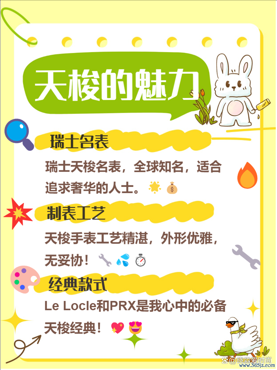 1️⃣ 瑞士名表 :算作瑞士名表,天梭一直以来王人以其高出的品性和可靠性而着名。🇨🇭✨我身边的一又友们王人对它拍案叫绝,特殊是在追求性价比的同期又但愿领有奢华感的时候,天梭真的很可以哦!🌟💰2️⃣ 制表工艺 :天梭的制表工艺可谓是精粹无比,每一只腕表王人经过严格的测试和综合的打磨。🔧🔍我的教育是,它们不仅外不雅文雅,况且在功能性上也毫欠调和,比如防水、抗震等遐想王人特殊出色!💦⏱️3️⃣ 经典姿色 :天梭推出了许多经典姿色,比如Tissot Le Locle和Tissot PRX,这些王人是我心目中的必备单品!😍🎉每次看到它们,我王人会念念起那些好意思好的时光,真的是太值得领有了!💖🕶️