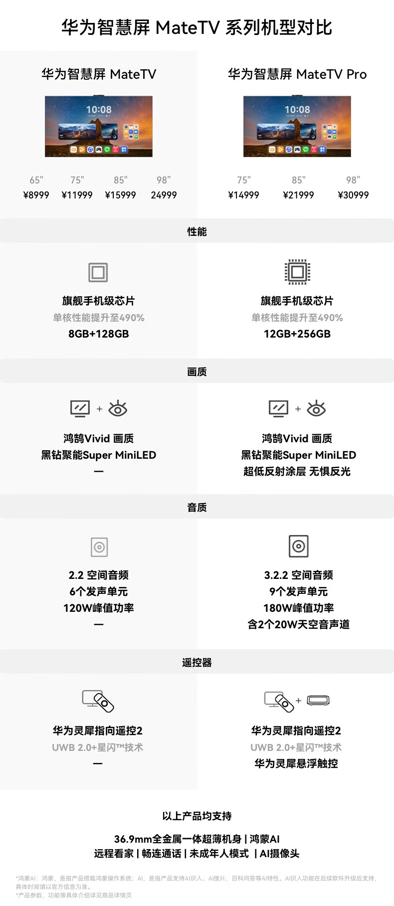 MateTV Pro:75 吋 14999 元、85 吋 21999 元、98 吋 30999 元。